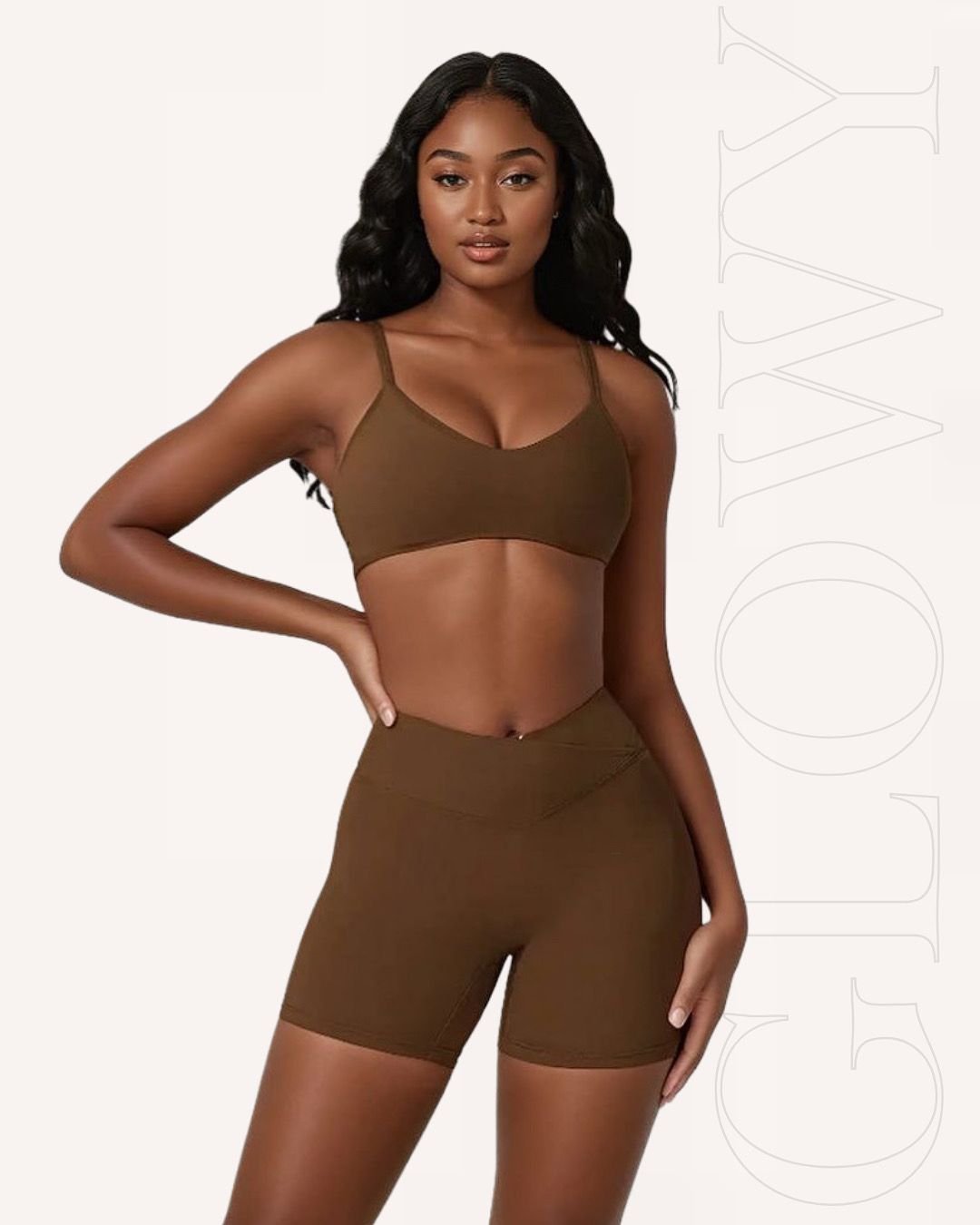Short biker marrom e top estruturado em tonalidade terrosa, ideal para quem ama sofisticação discreta. O tecido tem toque macio, respirável e não marca.